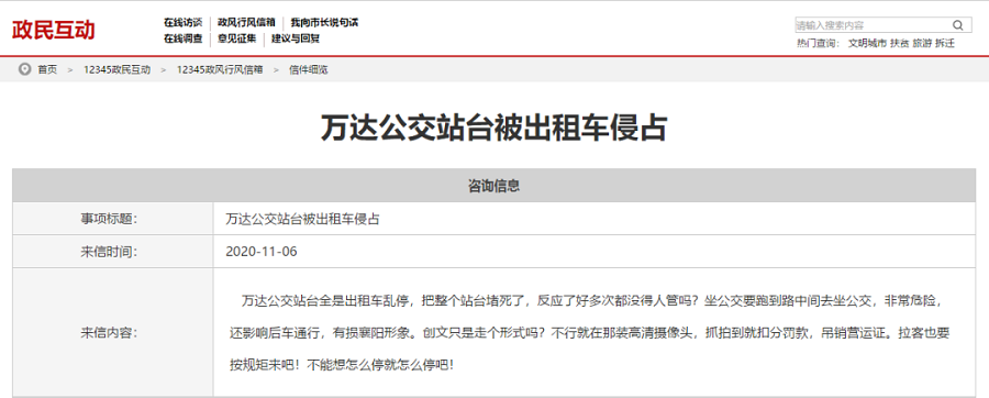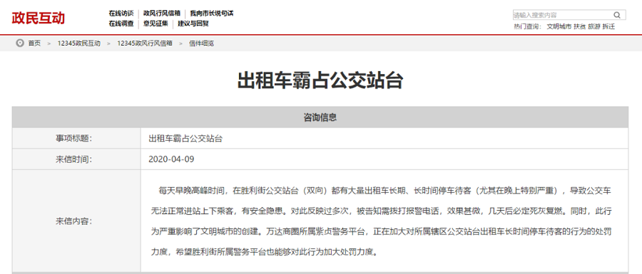對市公安局回復(fù):于上述所反映的情況,平臺已經(jīng)專門派警力對所述路段進行了違法停車清理且從重處罰,并將所處出租車違法情況通報該出租車所屬公司,作為"十差駕駛員"報交警支隊。后續(xù)平臺將會每天不定時巡查,隨時發(fā)現(xiàn)隨時處罰。