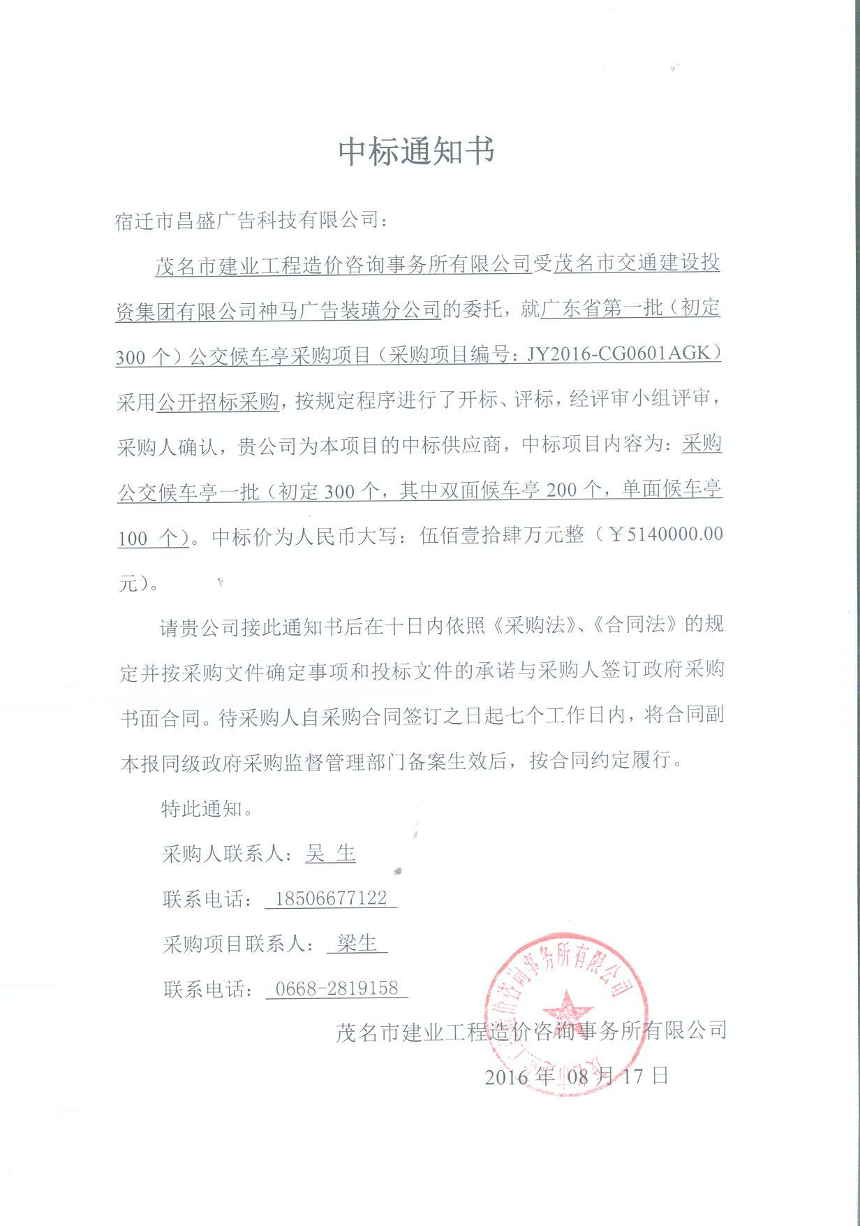 江蘇美城街具工貿(mào)有限公司于2016年8月17日競(jìng)得廣東省第一批(初定300個(gè))公交候車亭采購(gòu)項(xiàng)目(采購(gòu)項(xiàng)目編號(hào):JY2016-CG0601AGK)中標(biāo)金額:5140000元。