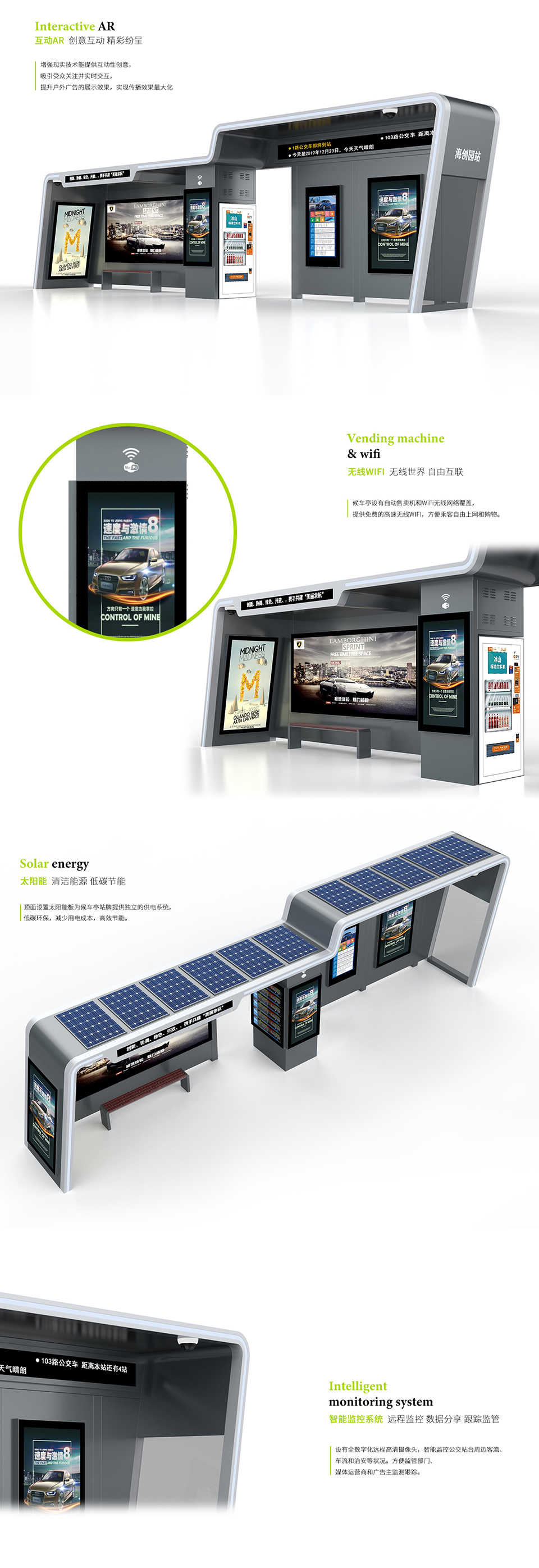 頂面設(shè)置太陽能板為候車亭站牌提供獨立的供電系統(tǒng),